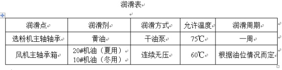 在日常運行中,應保證各潤滑點(diǎn)充分潤滑,并定期對粉分離器內軸承和風(fēng)機軸承進(jìn)行潤滑(見(jiàn)下表)。在日常維護中,注意粉體分離器轉子的平衡。如發(fā)現異常振動(dòng),應立即停機檢查原因,并可在運行前繼續故障。